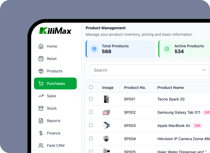 Manage your sales, inventory, and payments in one place. KiliMax keeps your business running smoothly, efficiently, and intelligently—anywhere, online or offline.