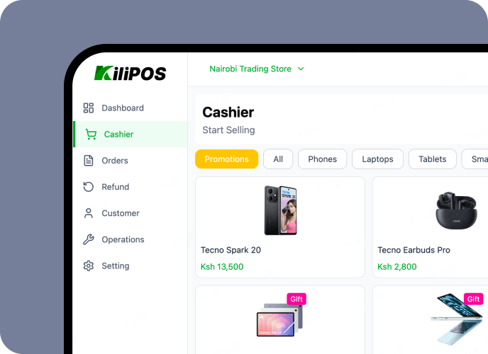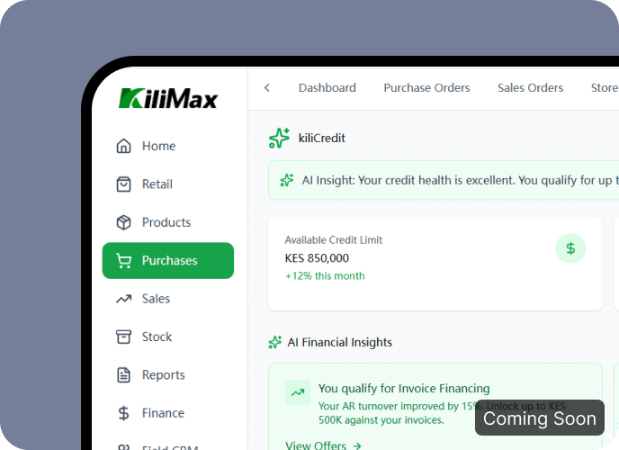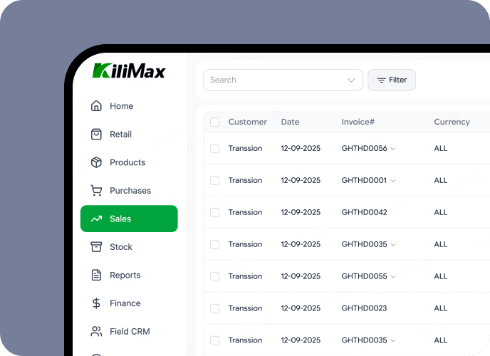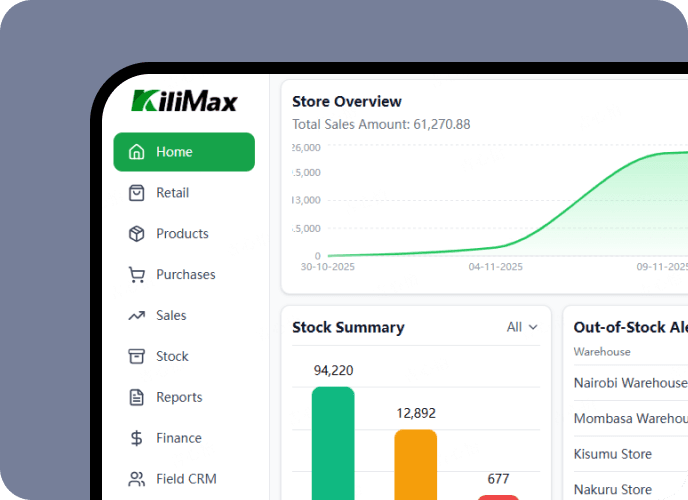 Manage your sales, inventory, and payments in one place. KiliMax keeps your business running smoothly, efficiently, and intelligently—anywhere, online or offline.